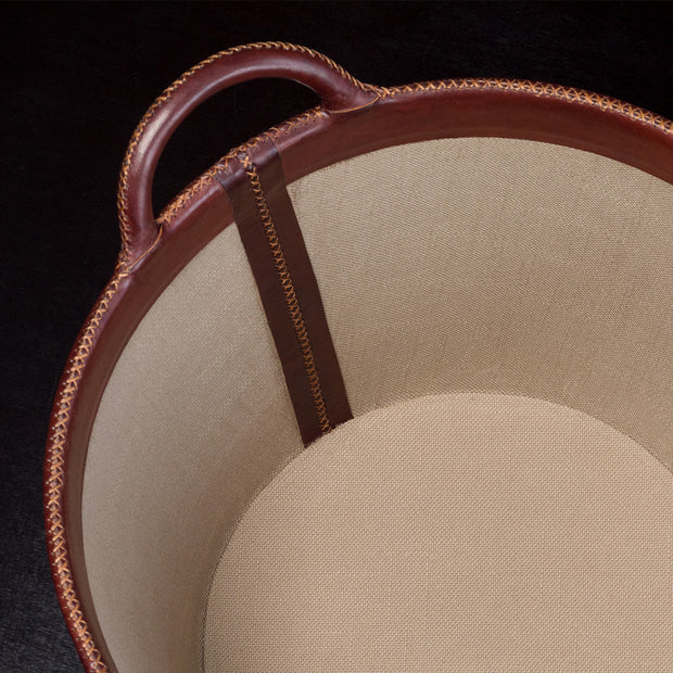 Die edlen Kaminholzkörbe aus natürlichem Rindsleder werden in unterschiedlicher Größe und Ausführung sorgfältig handgenäht bzw. -geflochten. Der Innenteil ist generell mit widerstandsfähigem Baumwoll-Canvas in beige/natur gefüttert bzw. ausgekleidet.