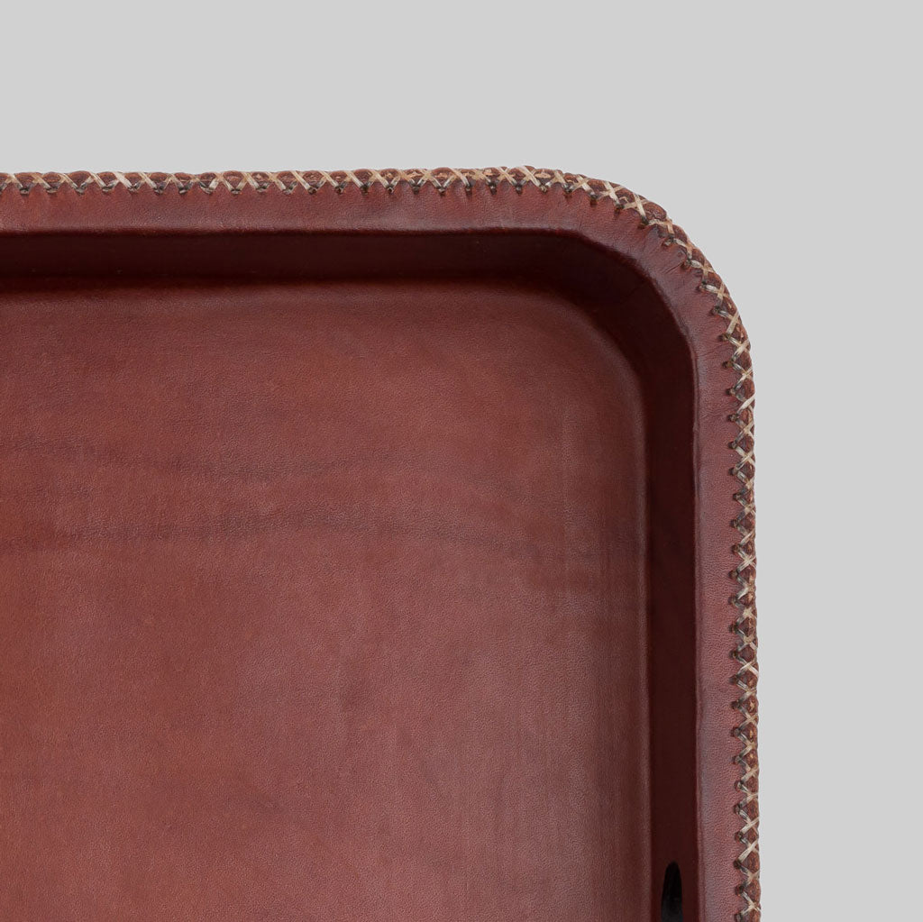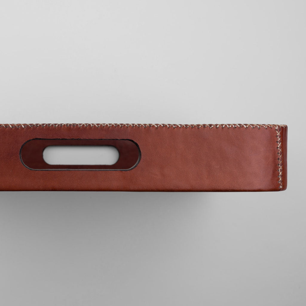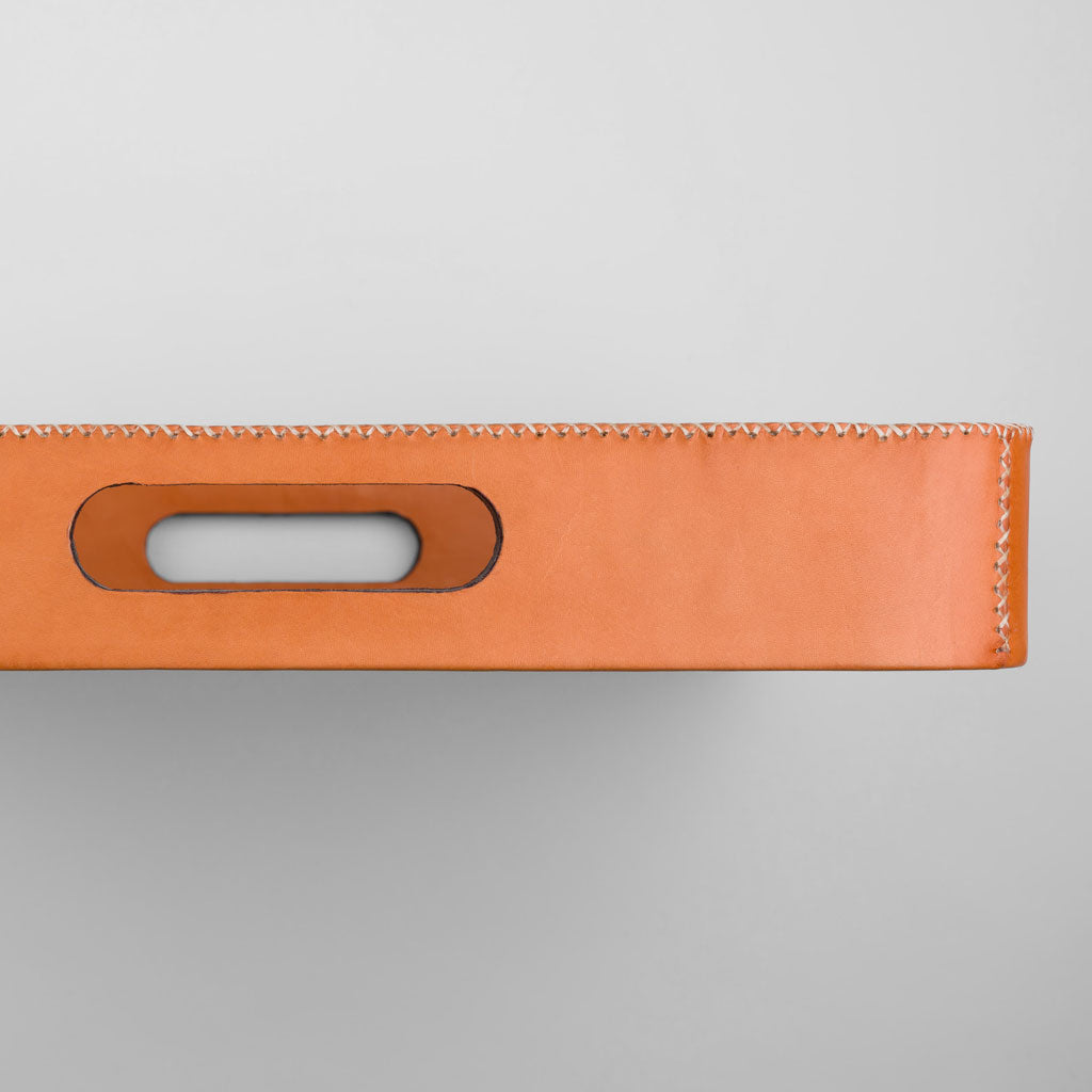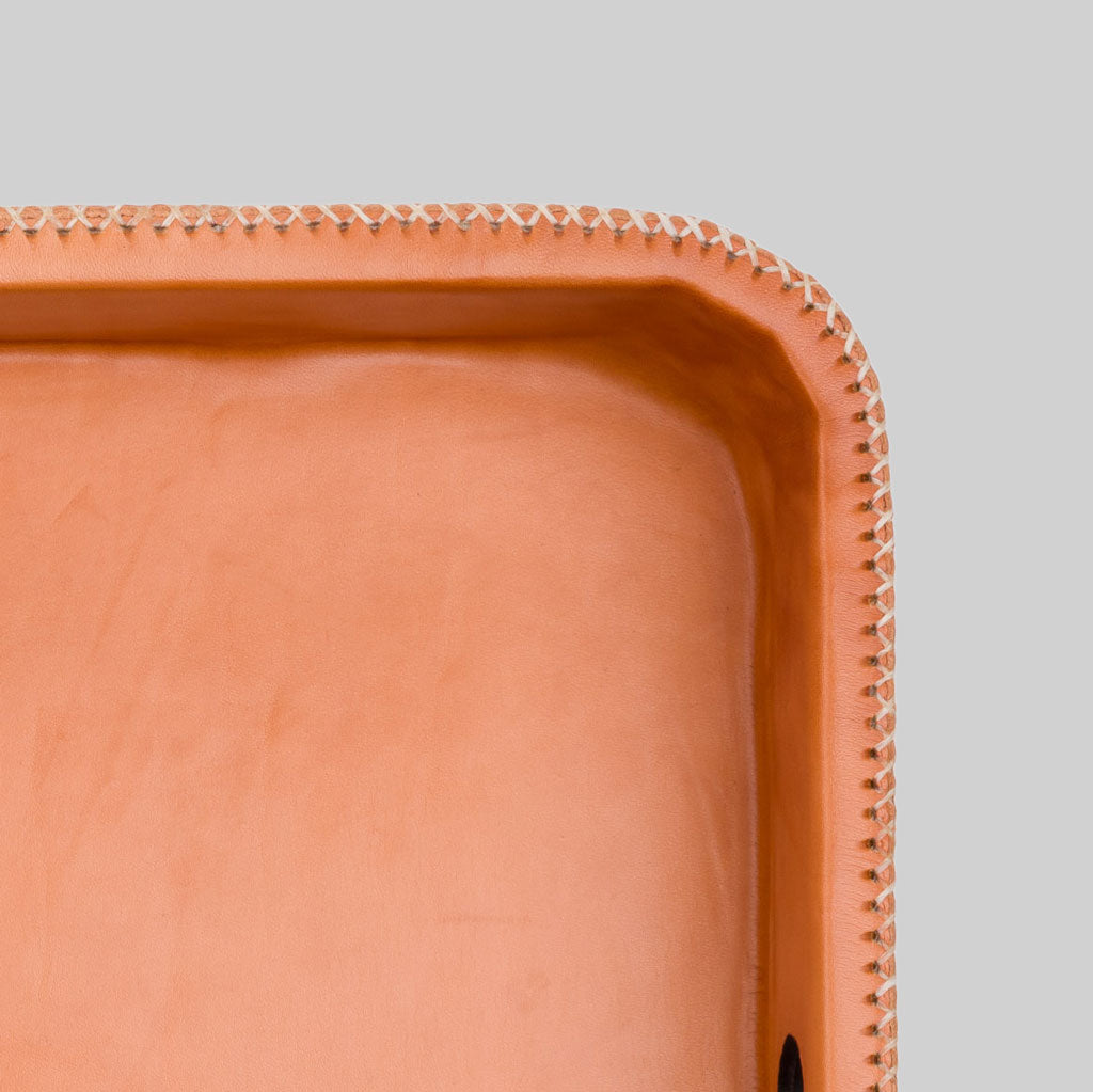 Die handgenähten Ledertabletts verfügen über einen stabilen Holzkern der sorgfältig mit Leder umhüllt ist. Dieses Überziehen mit reinem Naturleder erfolgt in überlieferter Handarbeit. Die einzelnen Lederteile werden dabei mit speziellem „Kreuzstich“ vernäht. Als zusätzliches handwerkliches Detail sorgen weiche Ledergriffe, mit selber Technik am Tablett befestigt, für lange Funktionsfähigkeit bei täglich freudvollem Gebrauch.
