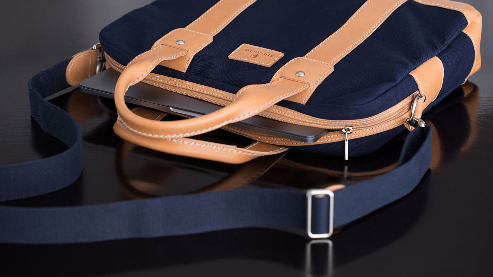 100% cotton canvas gently waxed, natural leather organically tanned, multifunctional interior hand-sewn. Selected hand-made pieces for many (computer) generations.