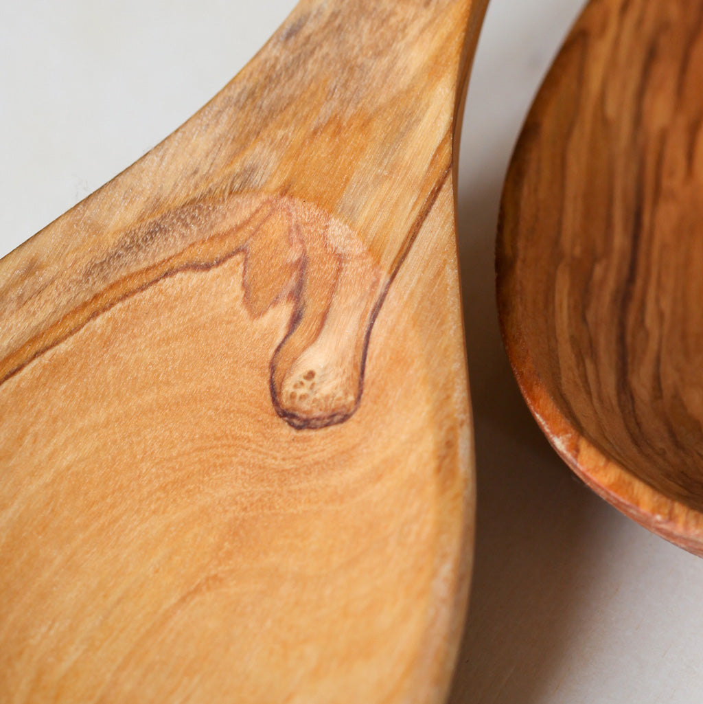 Handgefertigtes Salatbesteck aus massivem Olivenholz.