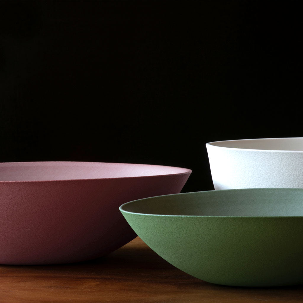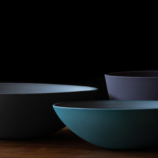 Die besondere Ästhetik der Giorgio Geschirr Kollektion beruht vor allem auf ungewöhnlichen Materialien und selten gewordenen Herstellungsverfahren. Teller und Schüsseln entstehen in einer Kombination von Formgebung mittels Gips Modell und zusätzlicher Hand-Dreharbeit auf der Töpferscheibe.