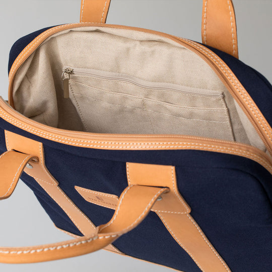Auch das multifunktionale Innenleben aus Baumwolle (beige/natur) ist sorgfältig per Hand verarbeitet. Eine eigene Innentasche mit Zipp als Fach für diverse Unterlagen, sowie verschiedene Einschubfächer für Servicekarten, Reisepass, etc. machen die Tasche zur idealen Begleiterin für unzählige Aufgaben und viele (Computer-) Generationen.