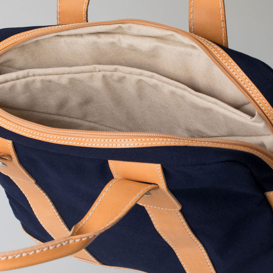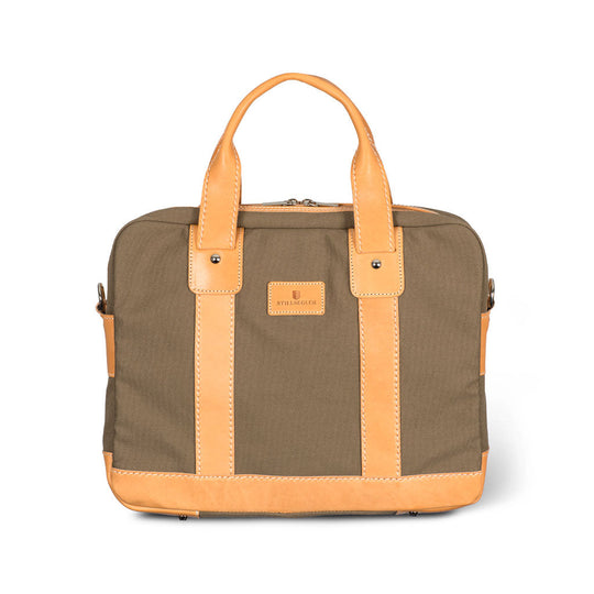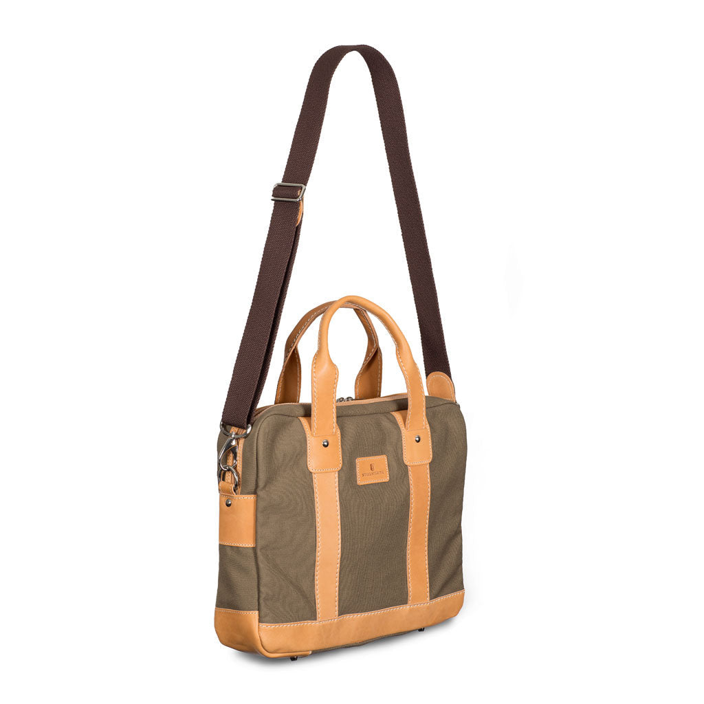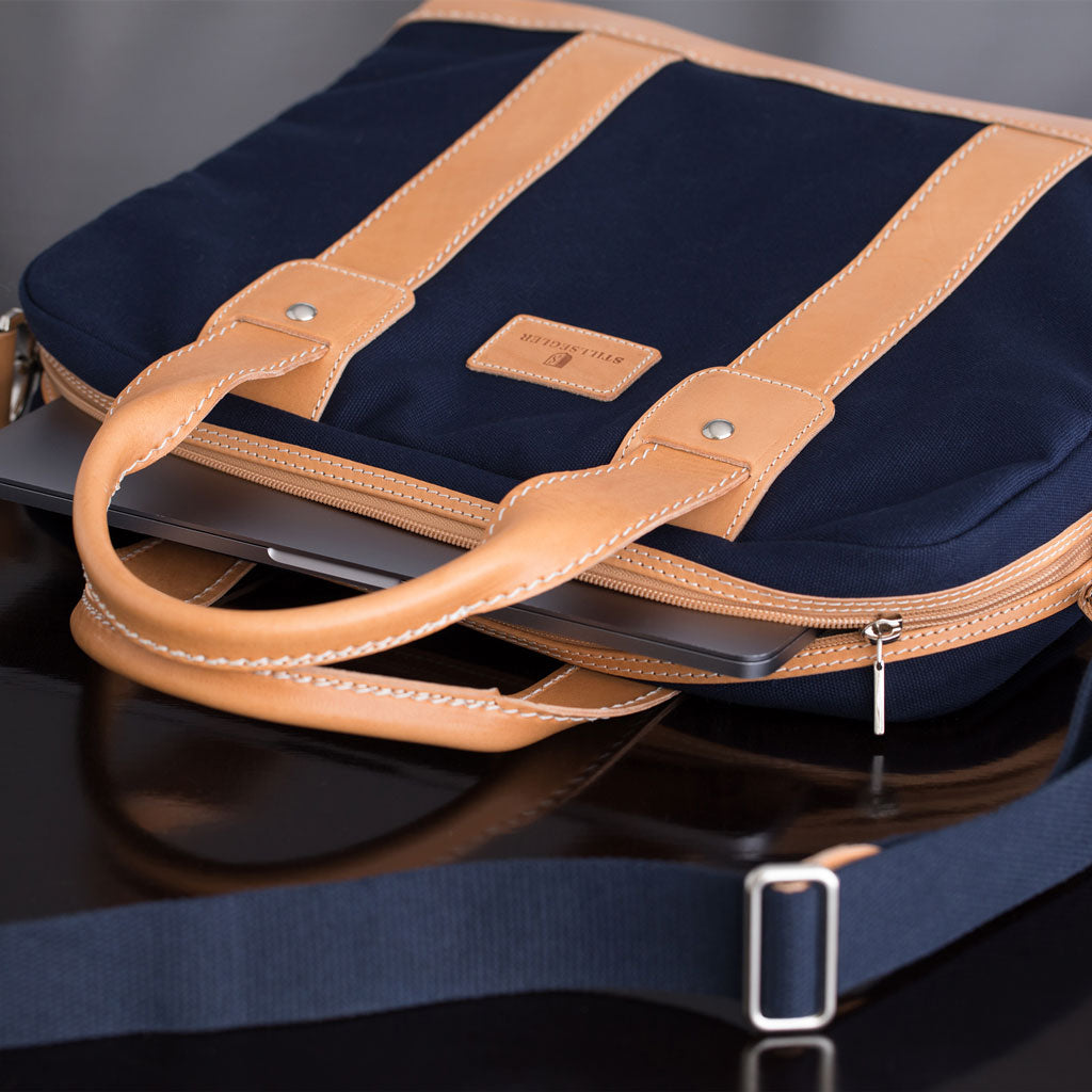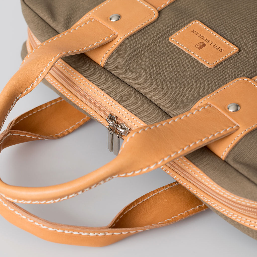Hochwertige, zart gewachste Baumwolle „Canvas cerato“ und festes, biologisch gegerbtes Naturleder bestimmen die Materialästhetik der Stillsegler Laptoptasche.