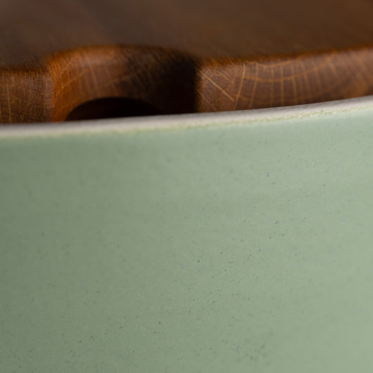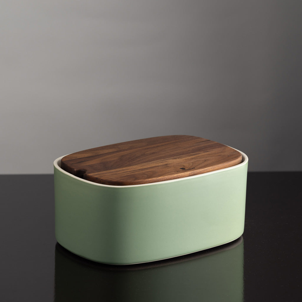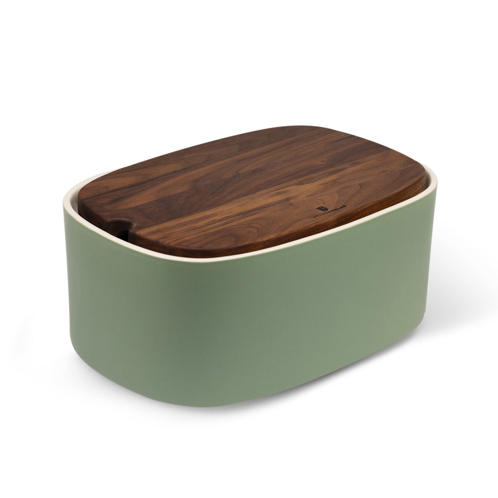 High-quality handmade ceramic container for ideal storage of bread and pastries. The robust walnut lid is impregnated with organic oil and also serves as a bread cutting board on the inside. The individual parts are largely made by hand in proven small businesses in Austria. High-quality ceramic production and fine woodworking have been highly valued in this country for generations.
