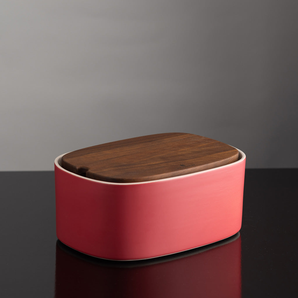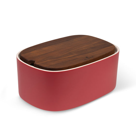 High-quality handmade ceramic container for ideal storage of bread and pastries. The robust walnut lid is impregnated with organic oil and also serves as a bread cutting board on the inside. The individual parts are largely made by hand in proven small businesses in Austria. High-quality ceramic production and fine woodworking have been highly valued in this country for generations.