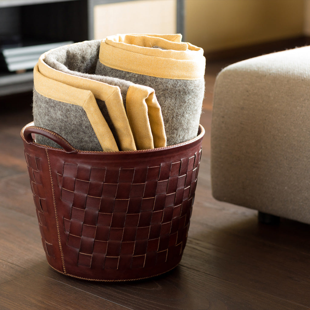 Die edlen Kaminholzkörbe aus natürlichem Rindsleder werden in unterschiedlicher Größe und Ausführung sorgfältig handgenäht bzw. -geflochten. Der Innenteil ist generell mit widerstandsfähigem Baumwoll-Canvas in beige/natur gefüttert bzw. ausgekleidet.