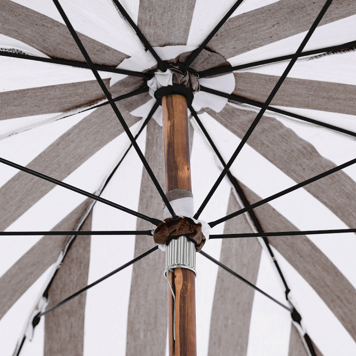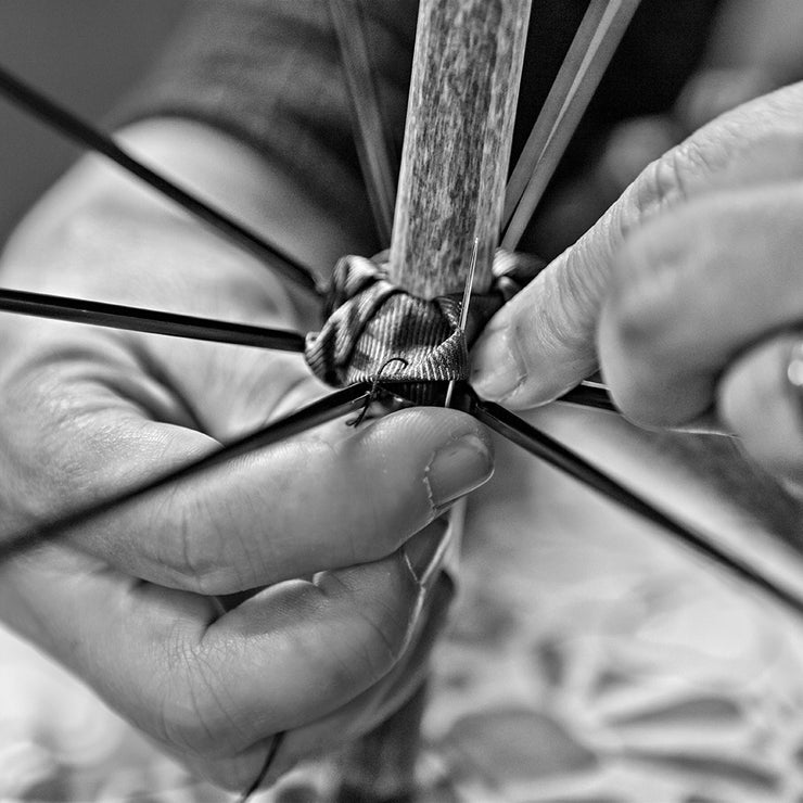 Die langlebigen, wasserabweisenden Bezugsstoffe werden eigens für Maglia in Italien gewebt, sind sorgfältig vernäht und mit den Speichen zu einem prächtigen Dach zusammengefügt. Alle Gelenke sind mit Stoff unterlegt, um jeden Schirm für ein langes Leben in natürlicher Schönheit zu rüsten.