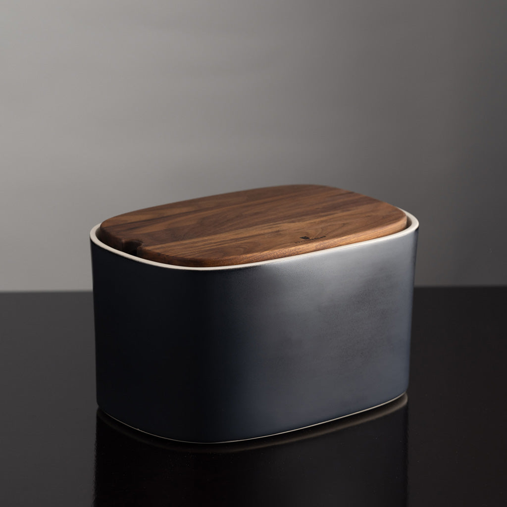Hochwertiges handgemachtes Keramikgefäß zur idealen Aufbewahrung von Brot und Gebäck. Der robuste Deckel aus Nussholz ist mit Bio-Öl imprägniert und dient auf der Innenseite zugleich als Brotschneidebrett. Die einzelnen Teile werden weitgehend in Handarbeit in bewährten Kleinbetrieben in Österreich hergestellt. Qualitätsvolle Keramikproduktion, wie auch feine Holzbearbeitung nehmen hierzulande seit Generationen einen hohen Stellenwert ein.