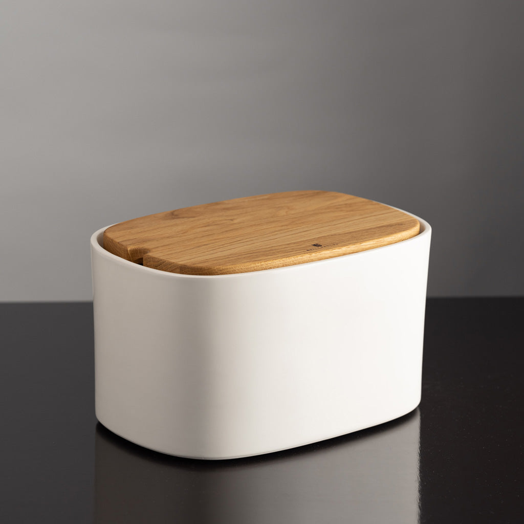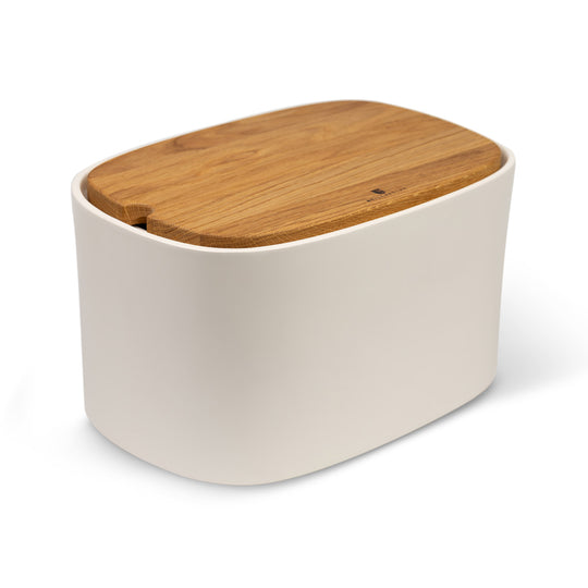 Hochwertiges handgemachtes Keramikgefäß zur idealen Aufbewahrung von Brot und Gebäck. Der robuste Deckel aus Eichenholz ist mit Bio-Öl imprägniert und dient auf der Innenseite zugleich als Brotschneidebrett. Die einzelnen Teile werden weitgehend in Handarbeit in bewährten Kleinbetrieben in Österreich hergestellt. Qualitätsvolle Keramikproduktion, wie auch feine Holzbearbeitung nehmen hierzulande seit Generationen einen hohen Stellenwert ein.
